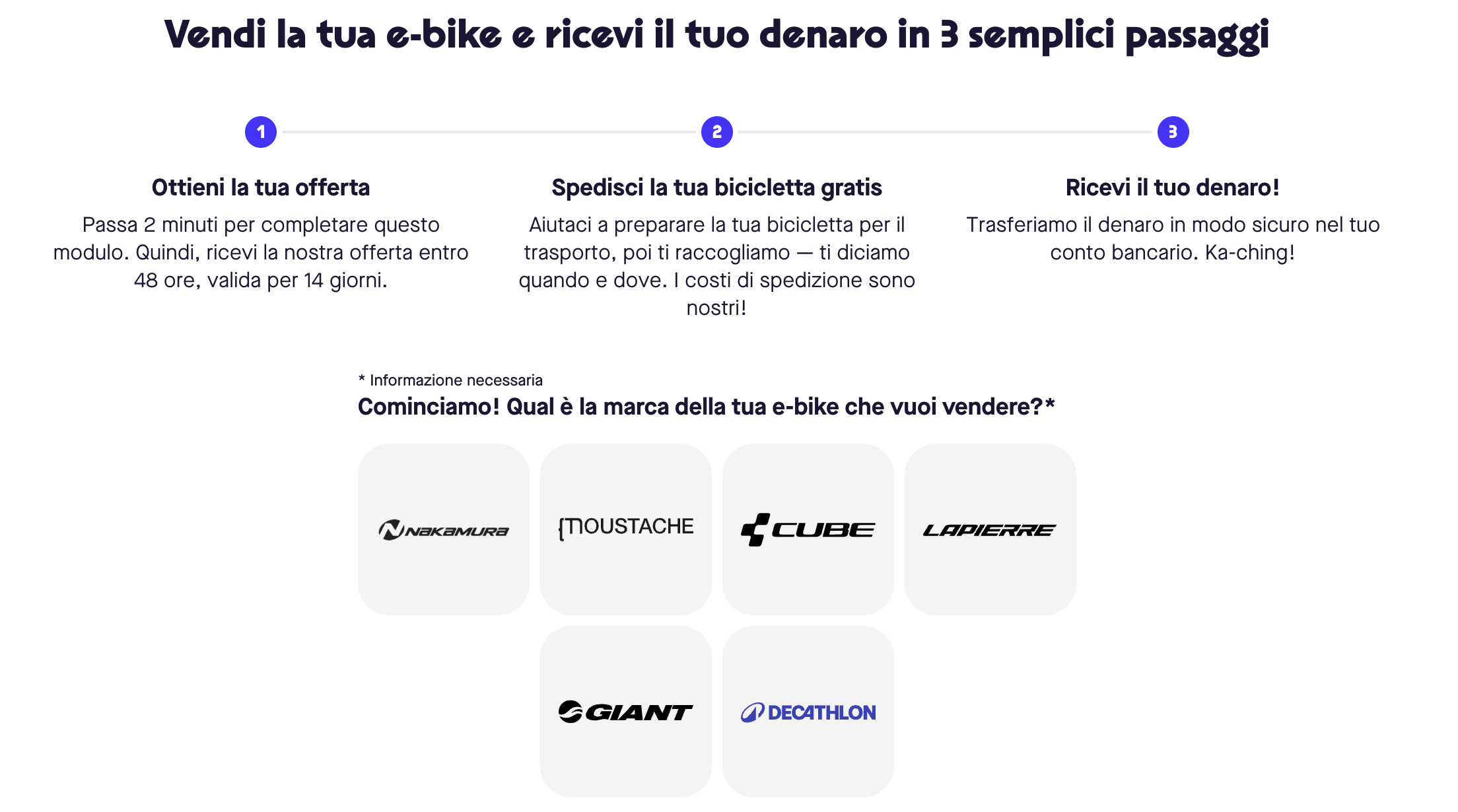 Compila questo breve modulo con le informazioni e le foto della tua bici elettrica, ricevi la nostra offerta entro 48 ore e prepara la bici per il ritiro: a tutto il resto pensiamo noi 📦