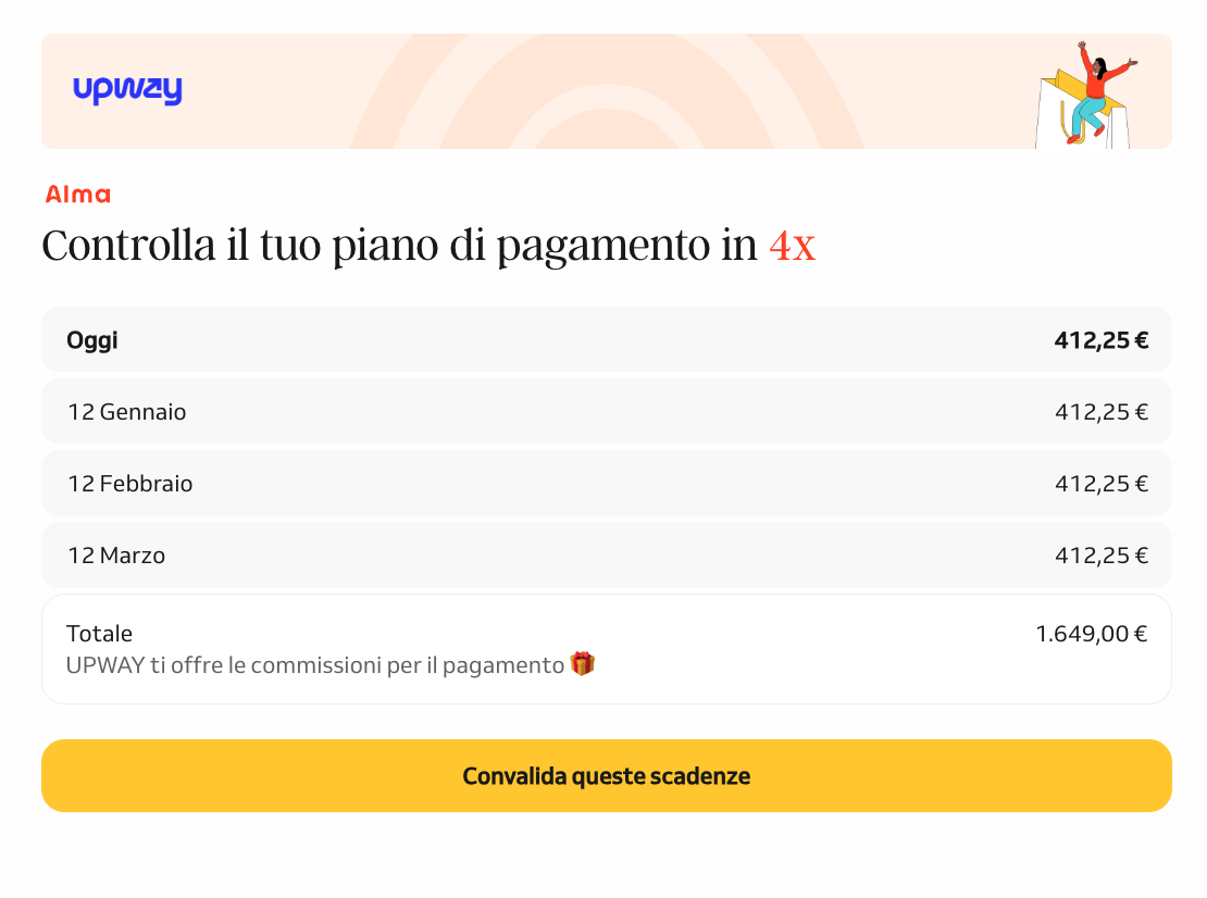 Grazie ad Alma paga in 2, 3 o 4 rate senza costi aggiuntivi.